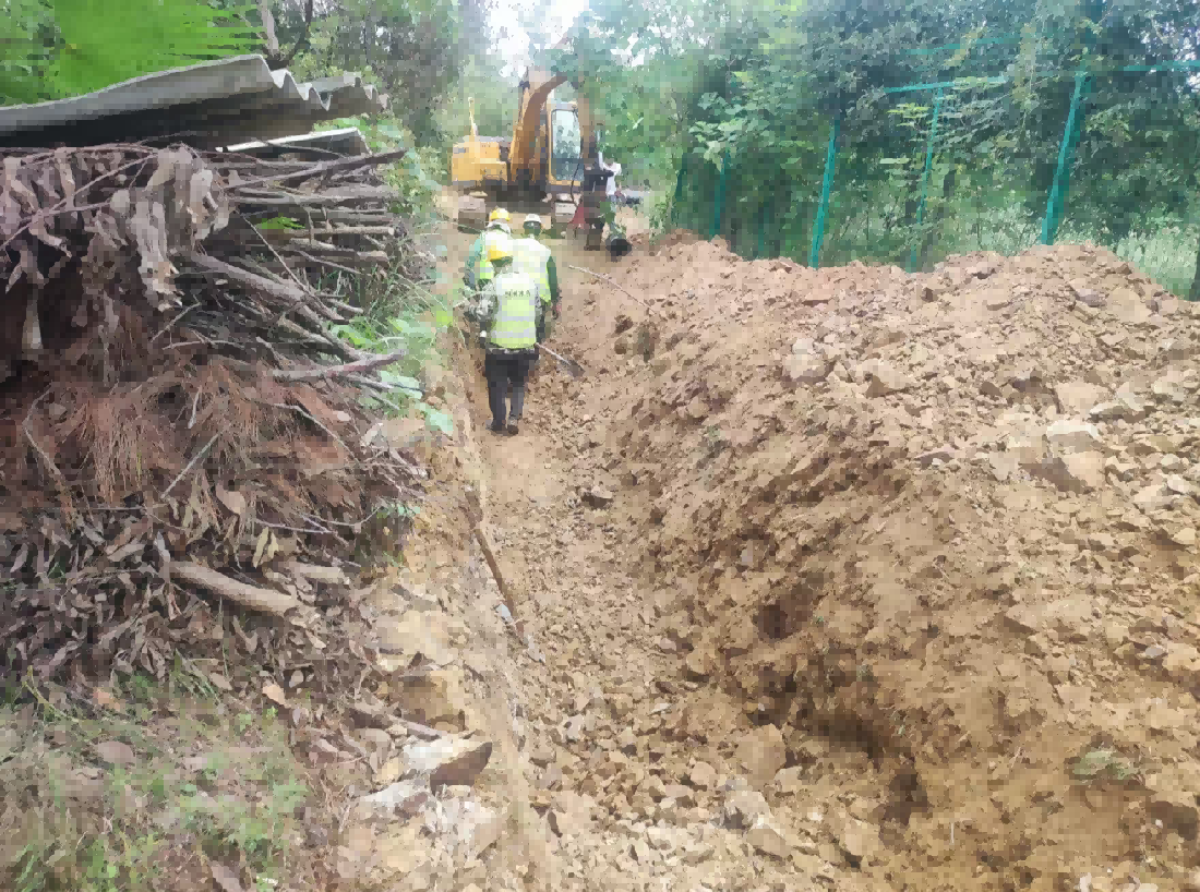 機(jī)電學(xué)校DN250球墨管供水工程線路處于山地丘陵地帶,沿線涉及鄉(xiāng)村道路、開(kāi)墾菜園、陡峭山體等多重地質(zhì)和復(fù)雜環(huán)境考驗(yàn)。在沿機(jī)電學(xué)校圍墻邊緣鋪設(shè)段,鄉(xiāng)村道路與圍墻之間不足3米的狹窄空間,成為施工線路上的“攔路虎”,該道路是周邊居民日常出行的主要通道,一旦長(zhǎng)時(shí)間阻斷,將嚴(yán)重影響群眾生活。項(xiàng)目部與學(xué)校和村委共同研討下,最終確定利用2天時(shí)間,集中突擊,調(diào)用多臺(tái)設(shè)備,全力沖刺,快速施工完成后復(fù)路于民,順利啃下硬骨頭。